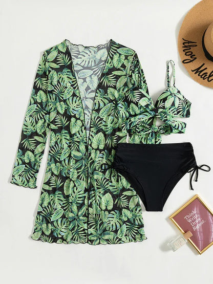 Women's tropical print bikini three-piece sets