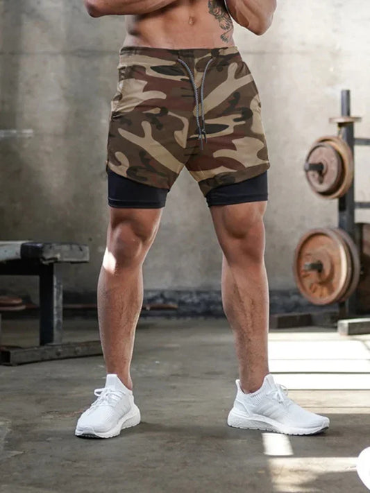 男士二合一运动短裤 全身迷彩印花抽绳短裤